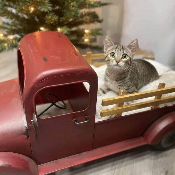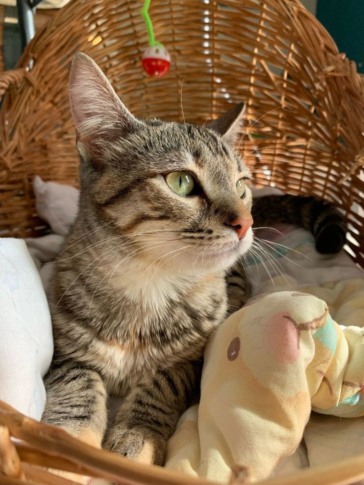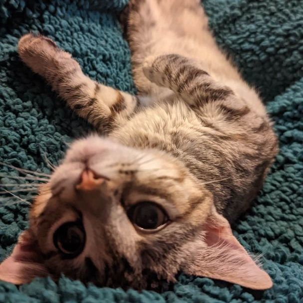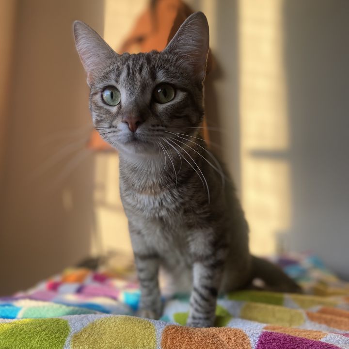 Whoever ends up adopting her will never be bored as long as she’s around. She loves to catch bugs, go on car rides, and steal food off of your plate if you’re not careful. She’s such a goofy and loving cat!