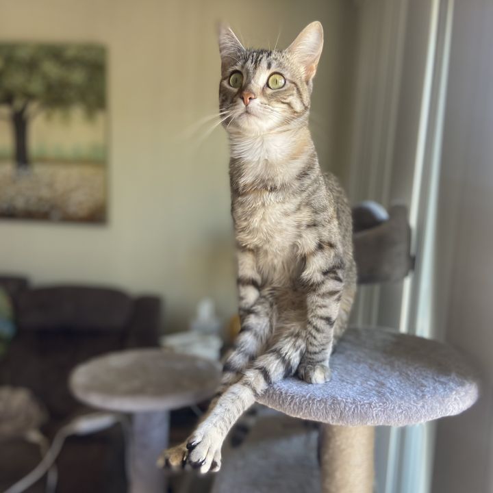 Not all angels have wings, sometimes they have whiskers. My name is El and I an adorable female gray tabby. I accidentally got closed in a door when I was a little kitten, so my hind end doesn’t work perfectly. I’m a little wobbly, but that doesn’t stop me! I will need to be expressed 3 times per day, as I can’t use the litter box on my own. I tolerate it well, and it’s not difficult at all. I have been exposed to dogs and other cats and so far, so good. I love cat savvy kids of all ages, and I love spring toys! I hope to find a loving home where I can spread my wings! My nature is fun and goofy! I promise you will never be bored as long as I am around. I love to catch bugs, go on car rides and even steal the food off of your plate if you aren’t watching! Please adopt me today!!